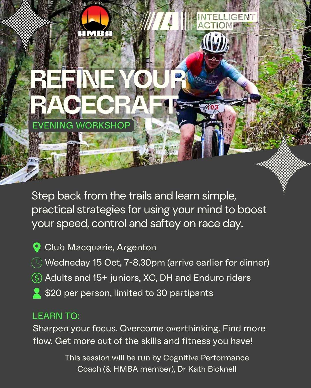 I’m also teaming up with the Hunter Mountain Bike Association to deliver an evening workshop on 15 October. The Refine Your Racecraft (or Ridecraft!) session runs from 7-8.30pm and is a great way to step back from the trails and skill up with some strategies that will see you get even more out of the fitness and equipment you have.